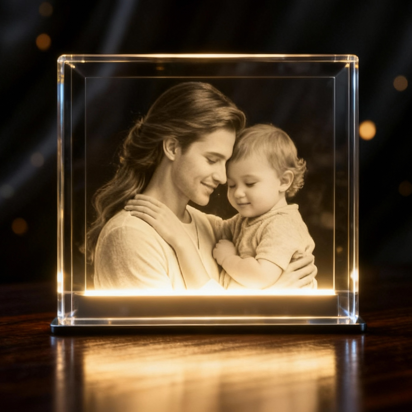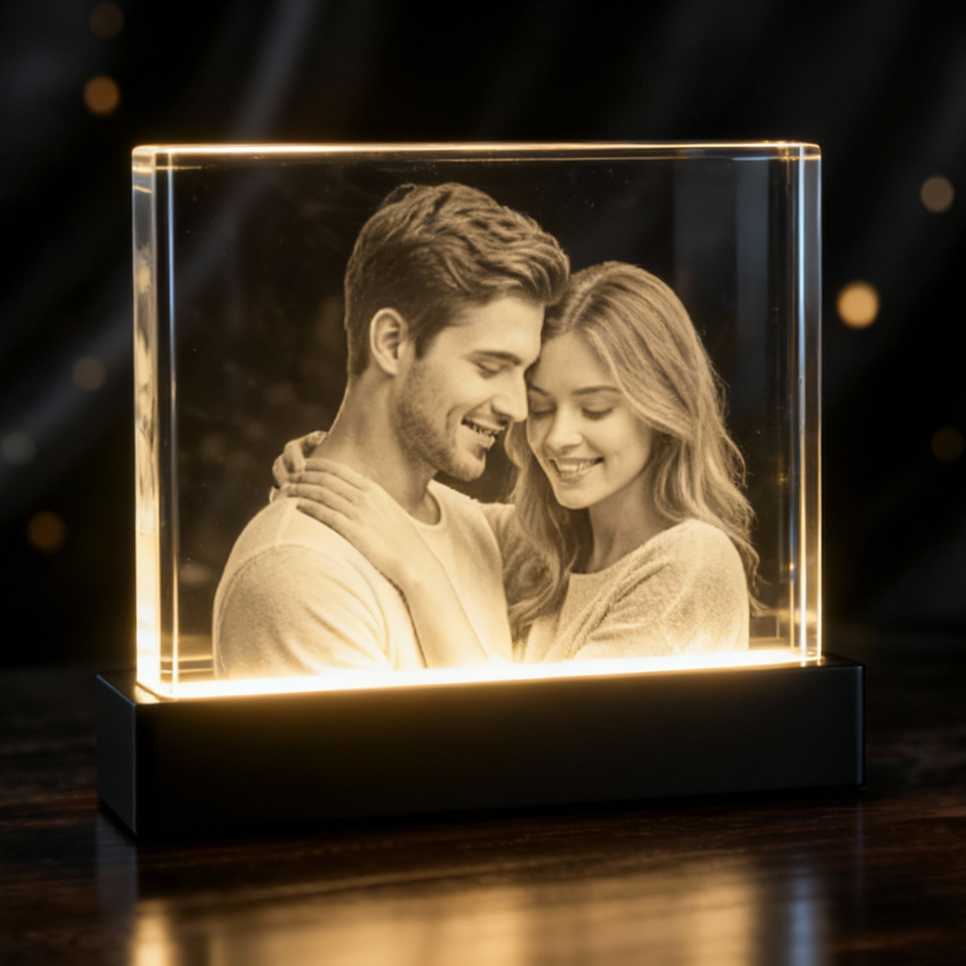 2D Fotoram med eller utan inbyggt ljus och olika storlekar. Ladda upp ditt foto med valfri text och skapa ett personligt minne eller ögonblick i äkta kristallglas – lasergraverad och tillverkad i Tyskland med 3D-Crystal® kvalitetsmärkning.