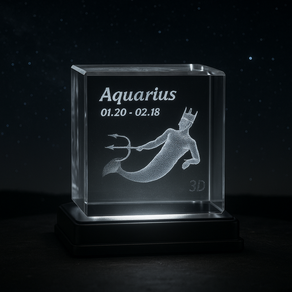 Aquarius 3D Kristall med graverat stjärntecken – en stilren och personlig gåva för dig född under Vattumannens tecken. Tillverkad i Tyskland med 3D-Crystal® märkning.