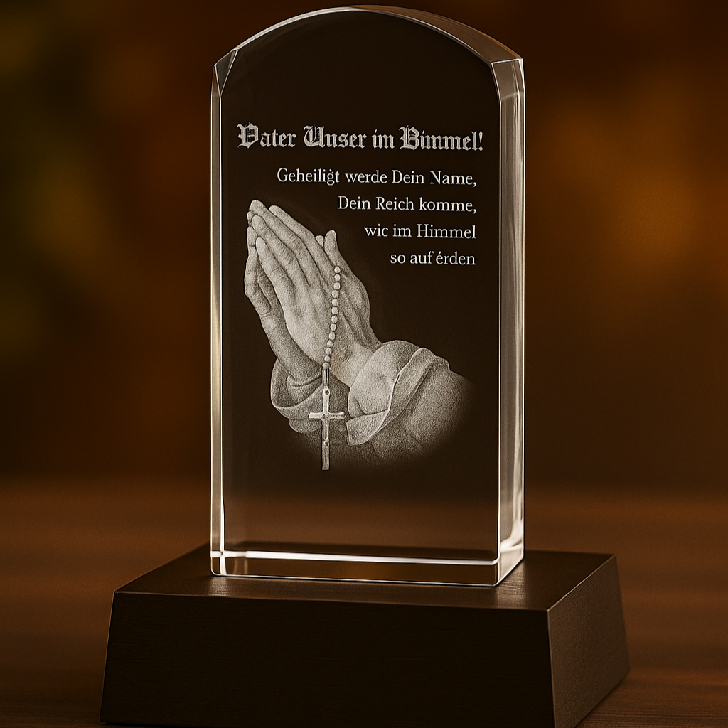 Händer bön 3D Kristall som ber ”vår far” i den senaste ton-tekniken som printas in i 3D -glas. Finns i Crystal Glass 100x70x60 F, 100x50x50 R och 80x50x50 mm.