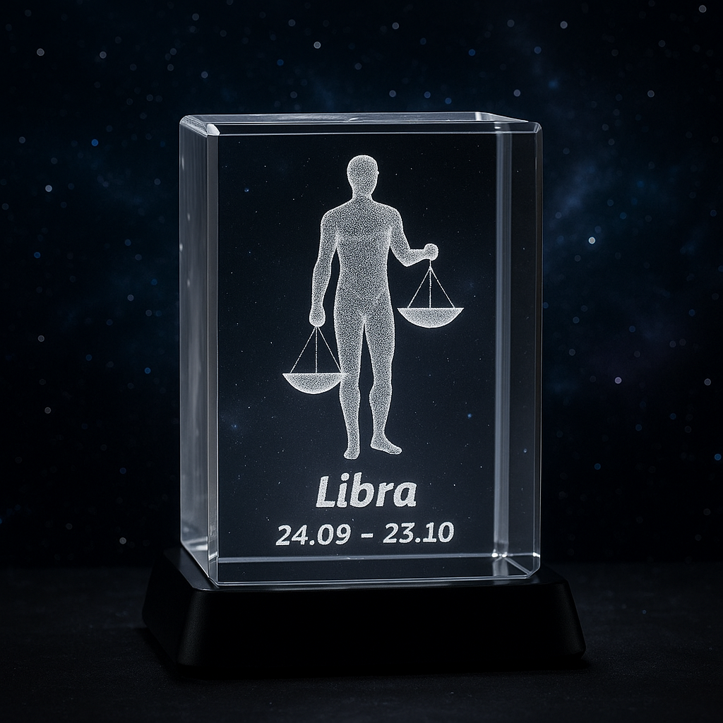 Libra 3D Kristall med graverat stjärntecken – en harmonisk och vacker kristall för dig född under Vågens tecken. Tillverkad i Tyskland med 3D-Crystal® märkning.