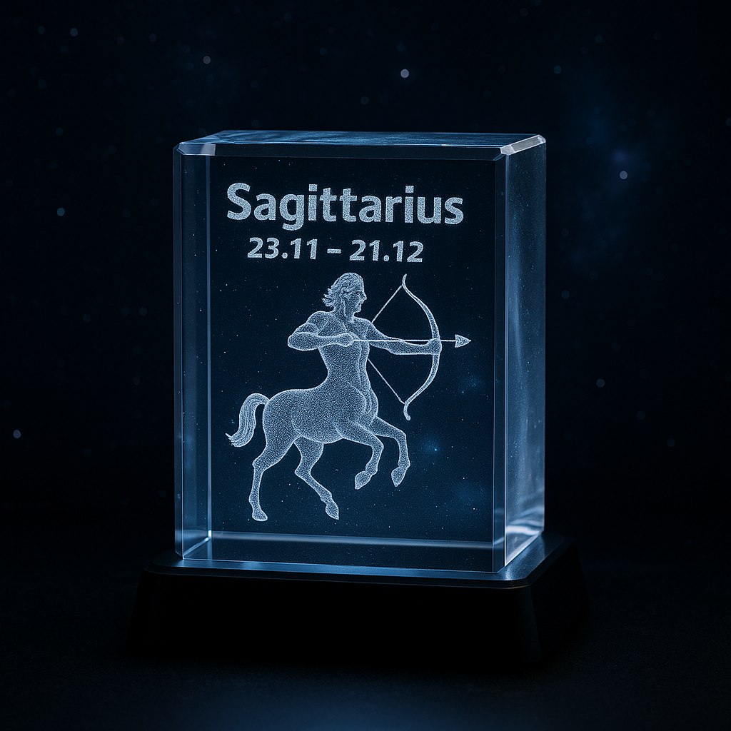 Sagittarius 3D Kristall med graverat stjärntecken – perfekt för dig född i Skyttens tecken. En stilren och personlig kristall tillverkad i Tyskland.