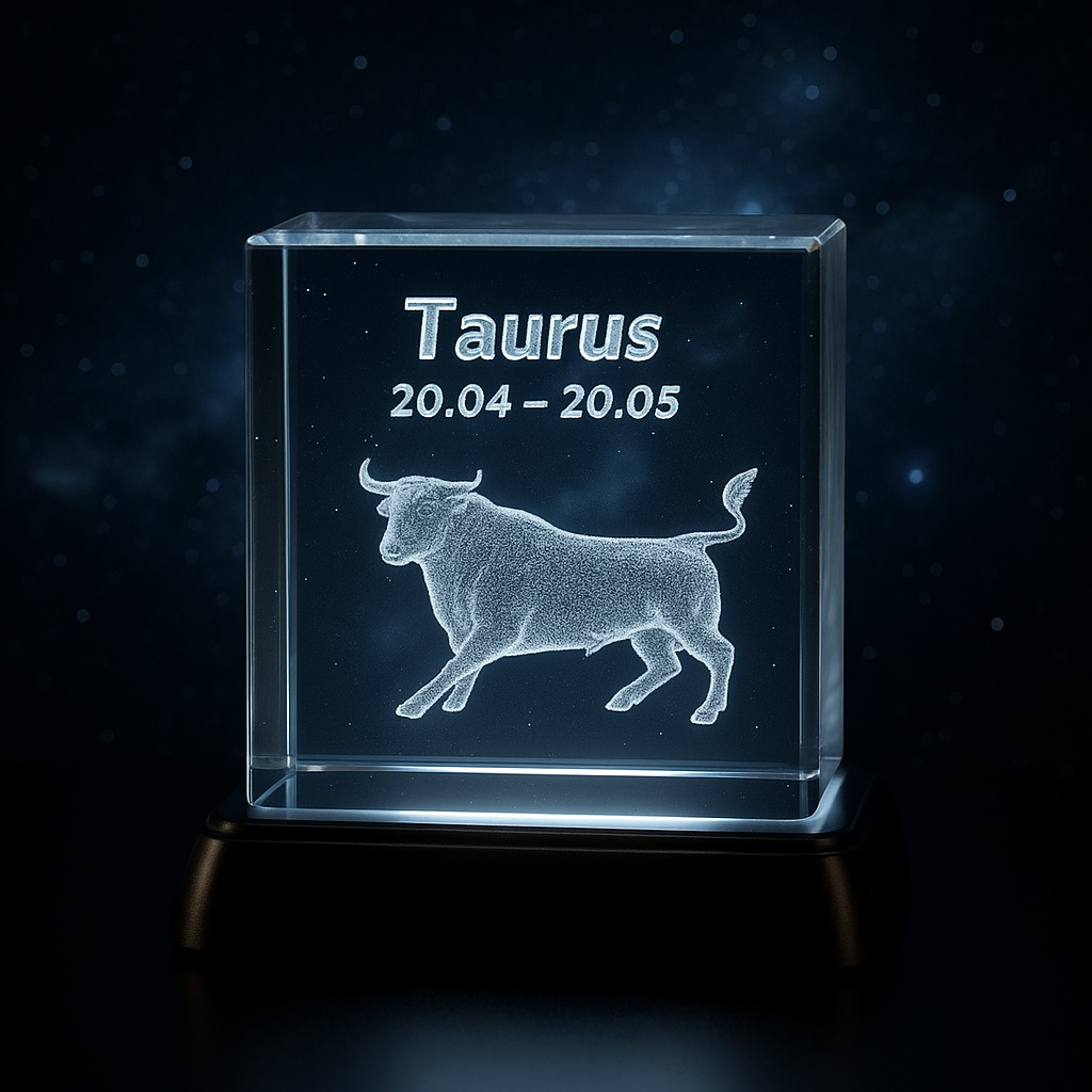 Taurus 3D Kristall med graverat stjärntecken – en stilren och personlig gåva för dig född under Oxens tecken. Tillverkad i Tyskland med 3D-Crystal® märkning.